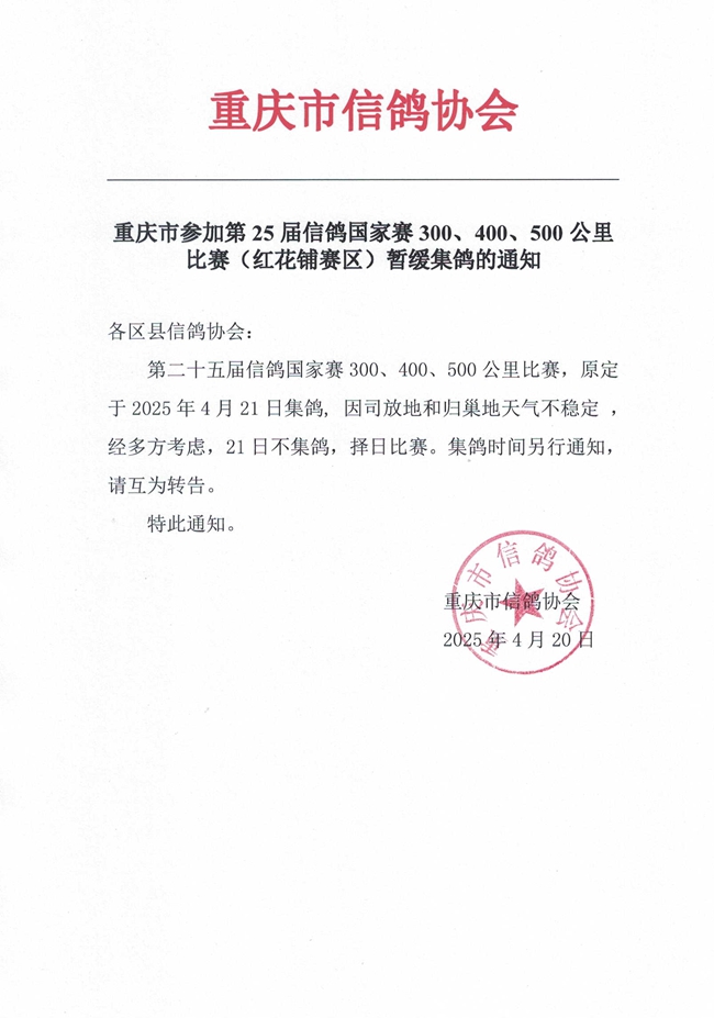 重庆市信鸽协会参加第25届信鸽国家赛300、400、500KM比赛暂缓集鸽的通知