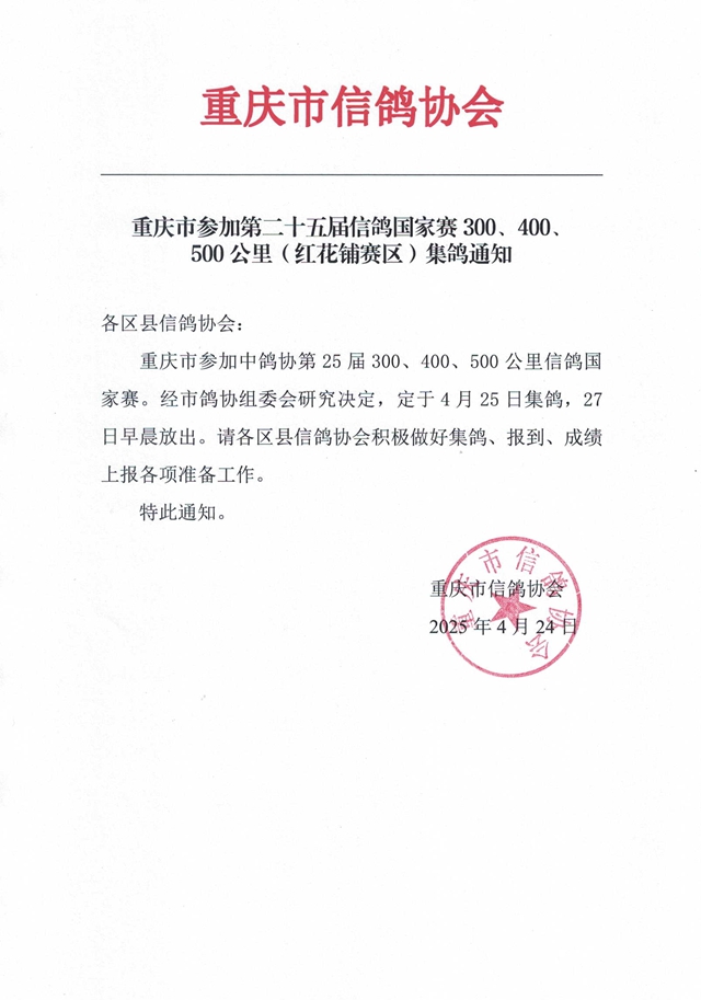 重庆市信鸽协会参加第二十五届信鸽国家赛300、400、500KM比赛集鸽的通知