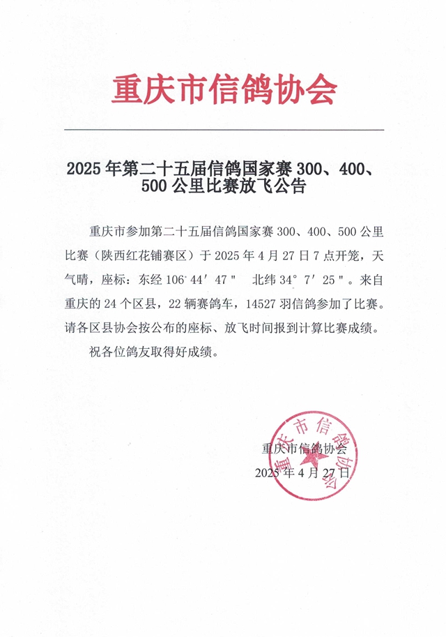 第二十五届信鸽国家赛红花铺赛区比赛放飞公告