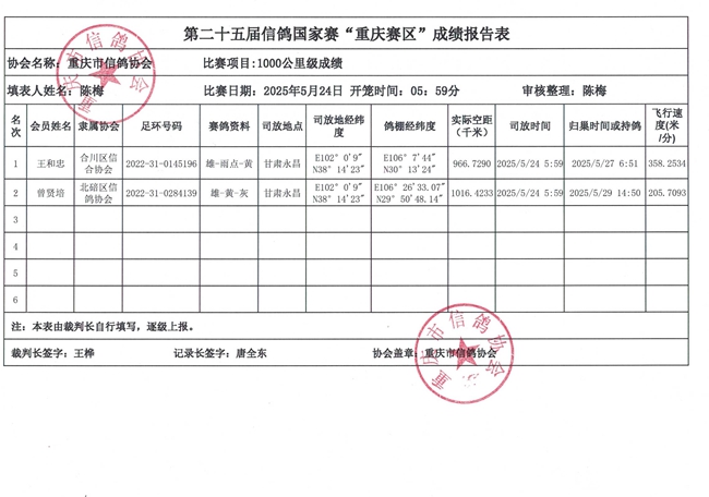 重庆市鸽会参加第二十五届信鸽国家赛1000KM永昌赛区成绩公示