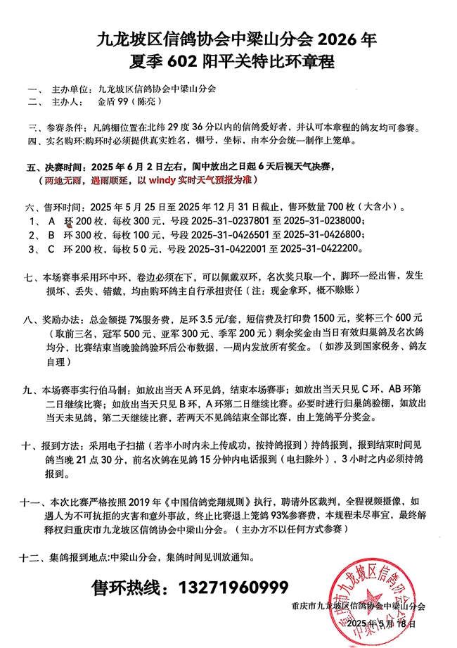 九龙坡区鸽会中梁山分会2026年602阳平关特比环章程