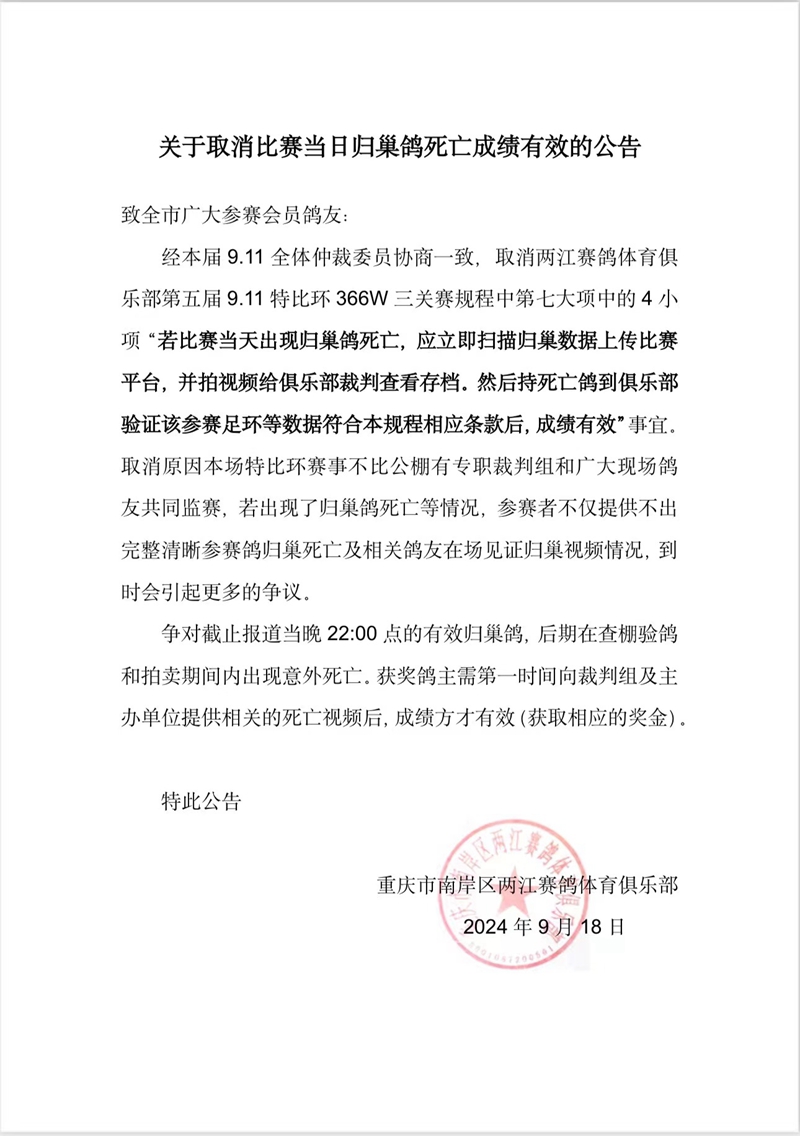 两江赛鸽俱乐部2025年911特比环赛规程补充公告
