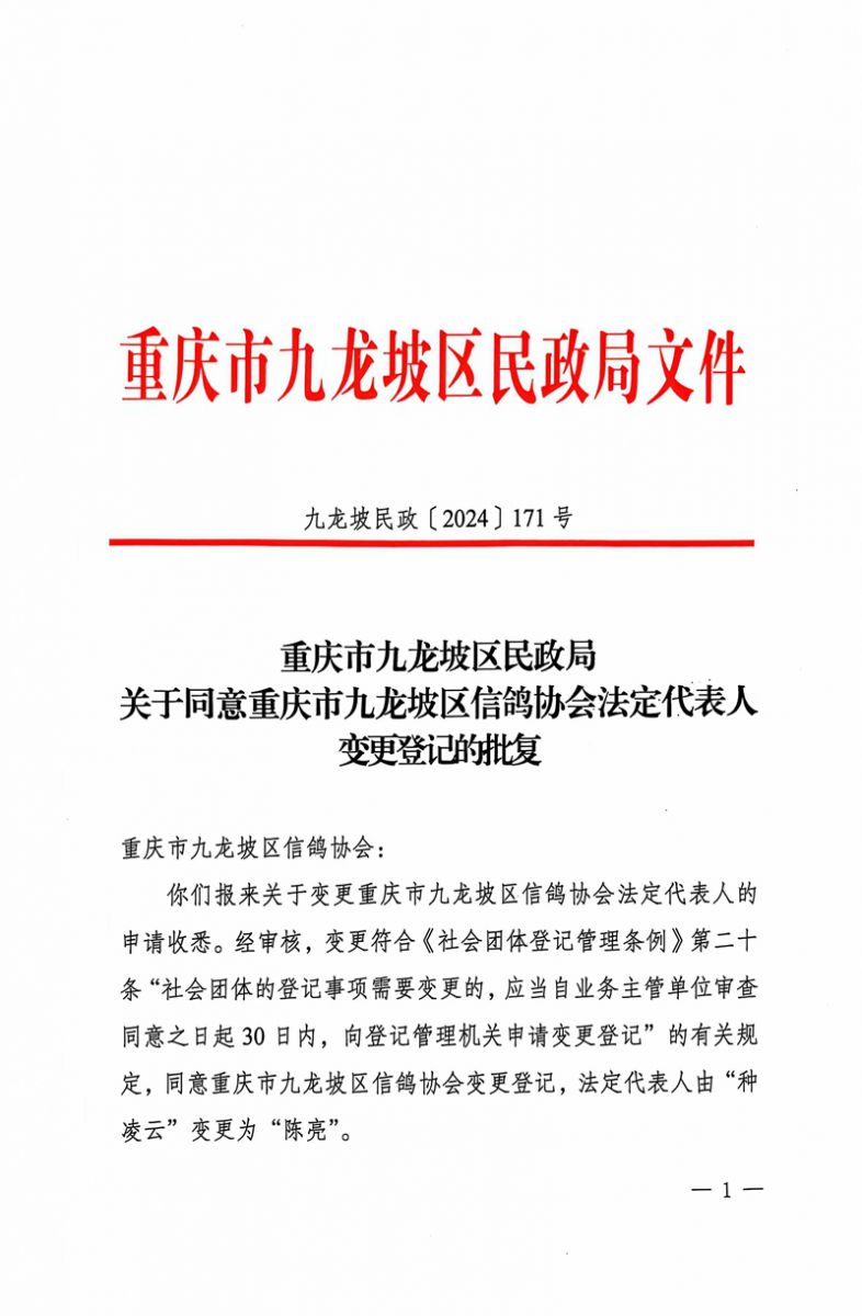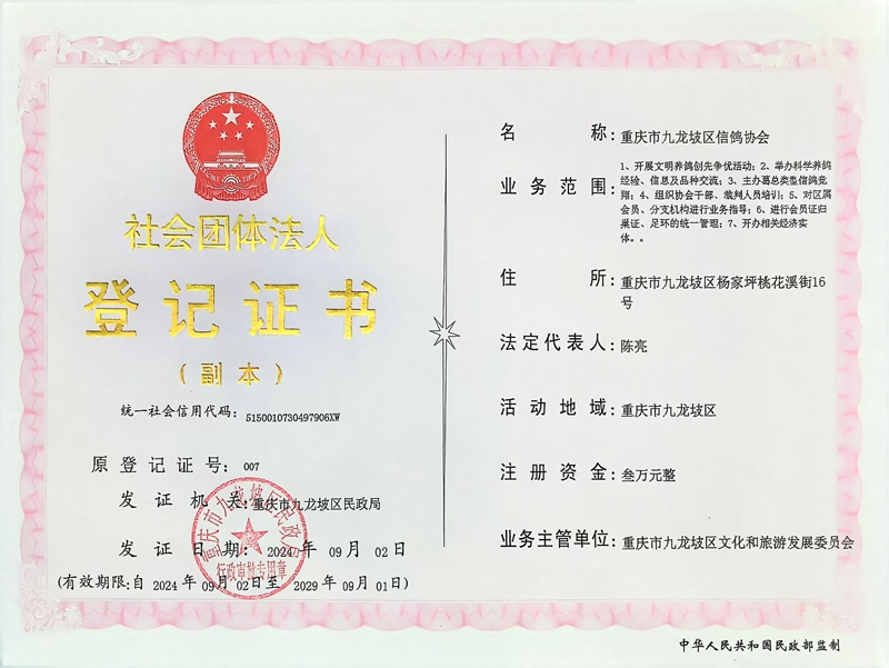 九龙坡区信鸽竞翔中心于2024年11月22号在九龙坡区石桥铺华宇老街印象132号挂牌成立。九龙坡区信鸽协会2025年开始所有赛事将在九龙坡区信鸽竞翔中心举办。我区所有会员相信在陈亮会长的带领下,九龙坡区信鸽协会的赛事会更上一层楼!