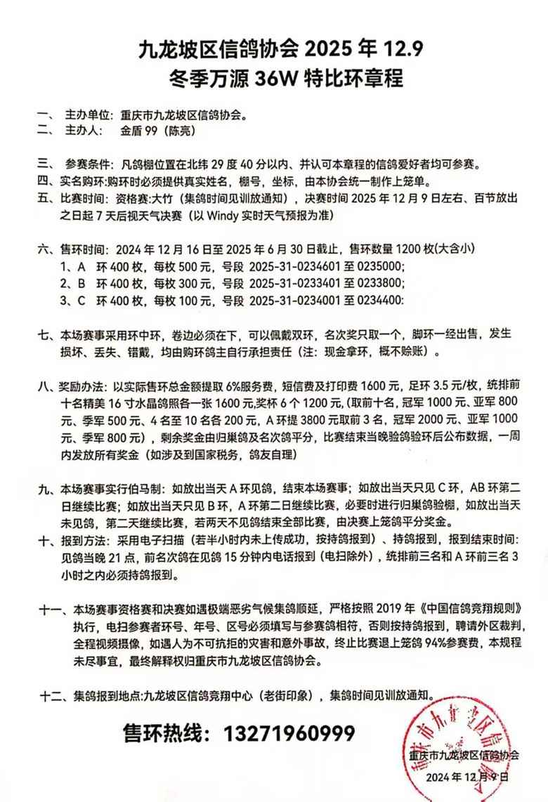 九龙坡区鸽会2025年12.9冬赛万源36W特比环章程