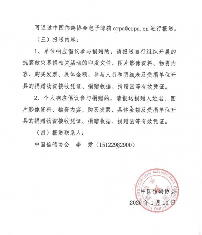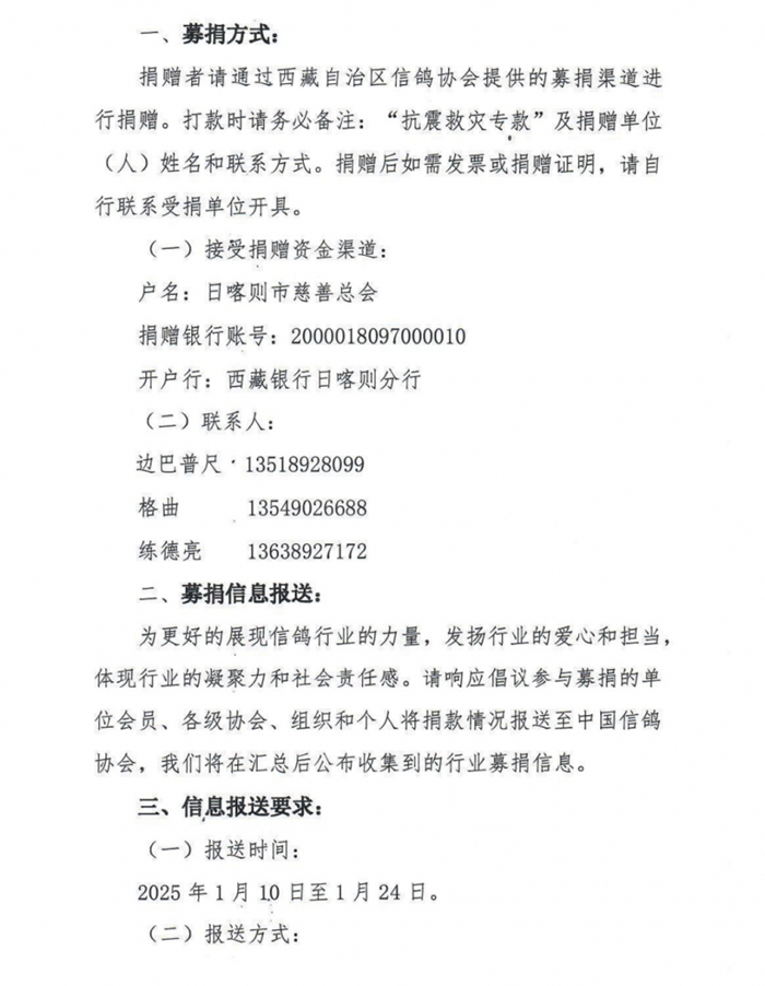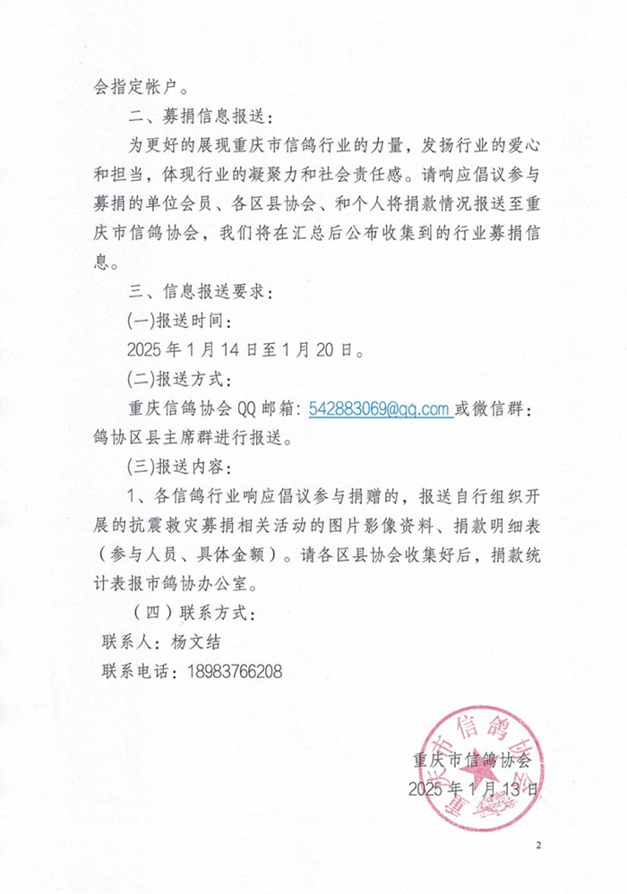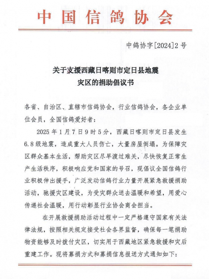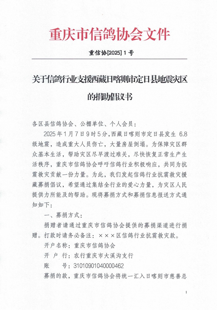 重庆市信鸽协会关于信鸽行业支援西藏日喀则市定日县地震灾区的捐助倡议书