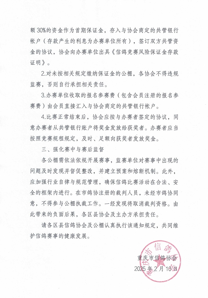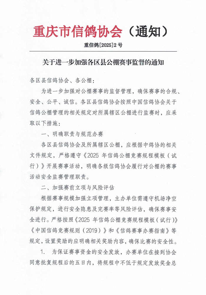重庆市信鸽协会关于进一步加强各区县公棚赛事监督的通知