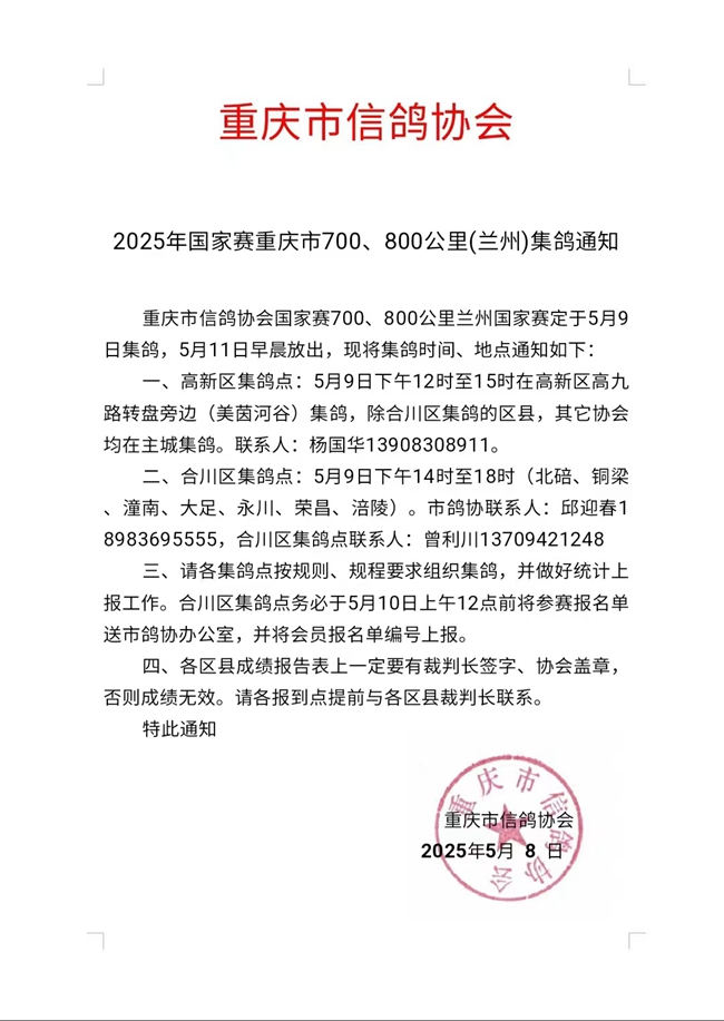 2025年国家赛重庆市700、800公里兰州集鸽通知