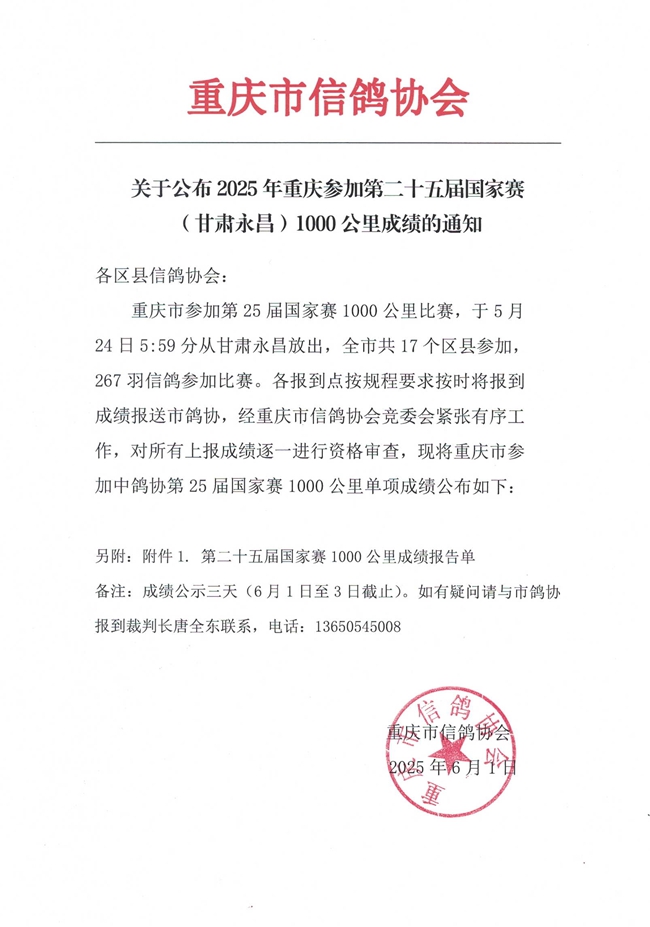 重庆市鸽会参加第二十五届信鸽国家赛1000KM永昌赛区成绩公示