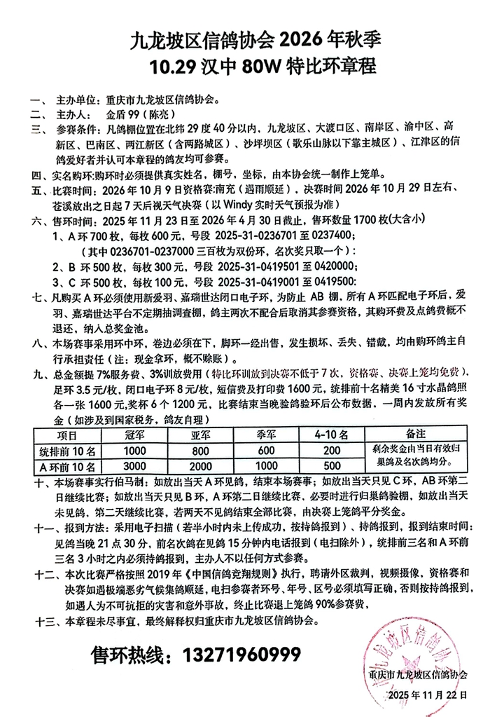 九龙坡区鸽会2026年秋季10.29汉中80W特比环规程
